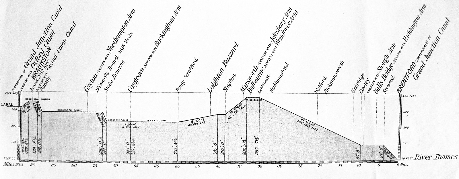 Sectional diagram of the Grand Junction Canal showing heights above datum at Brentford and gradients.